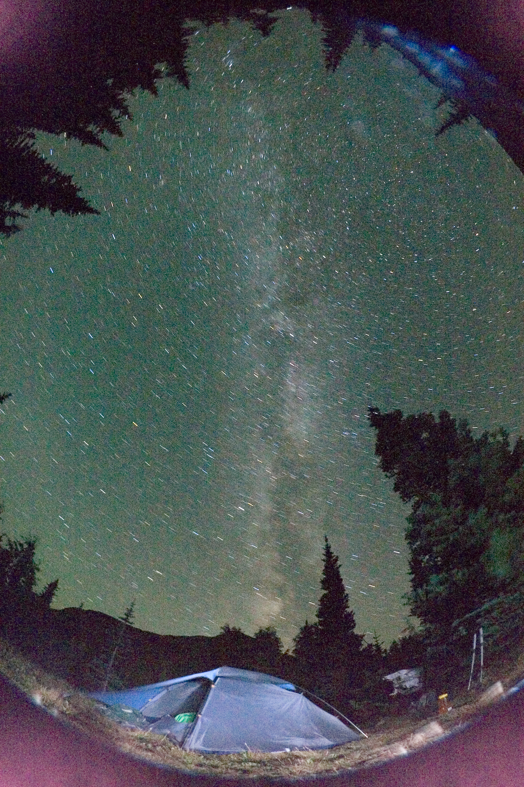 Milky Way over the tent around midnight. (5-minute time exposure.)