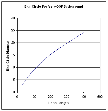 Aha!  This graph gives us new insight.  Yes, it’s true that for points close to the focus plane, the blur circle diameter does not vary with lens length.  (Actually, it varies a tiny bit, but nothing you’d ever notice.)  On the other hand, for distant background, longer lenses do in fact produce bigger blur circles, and bigger blur circles is equivalent to more OOF.