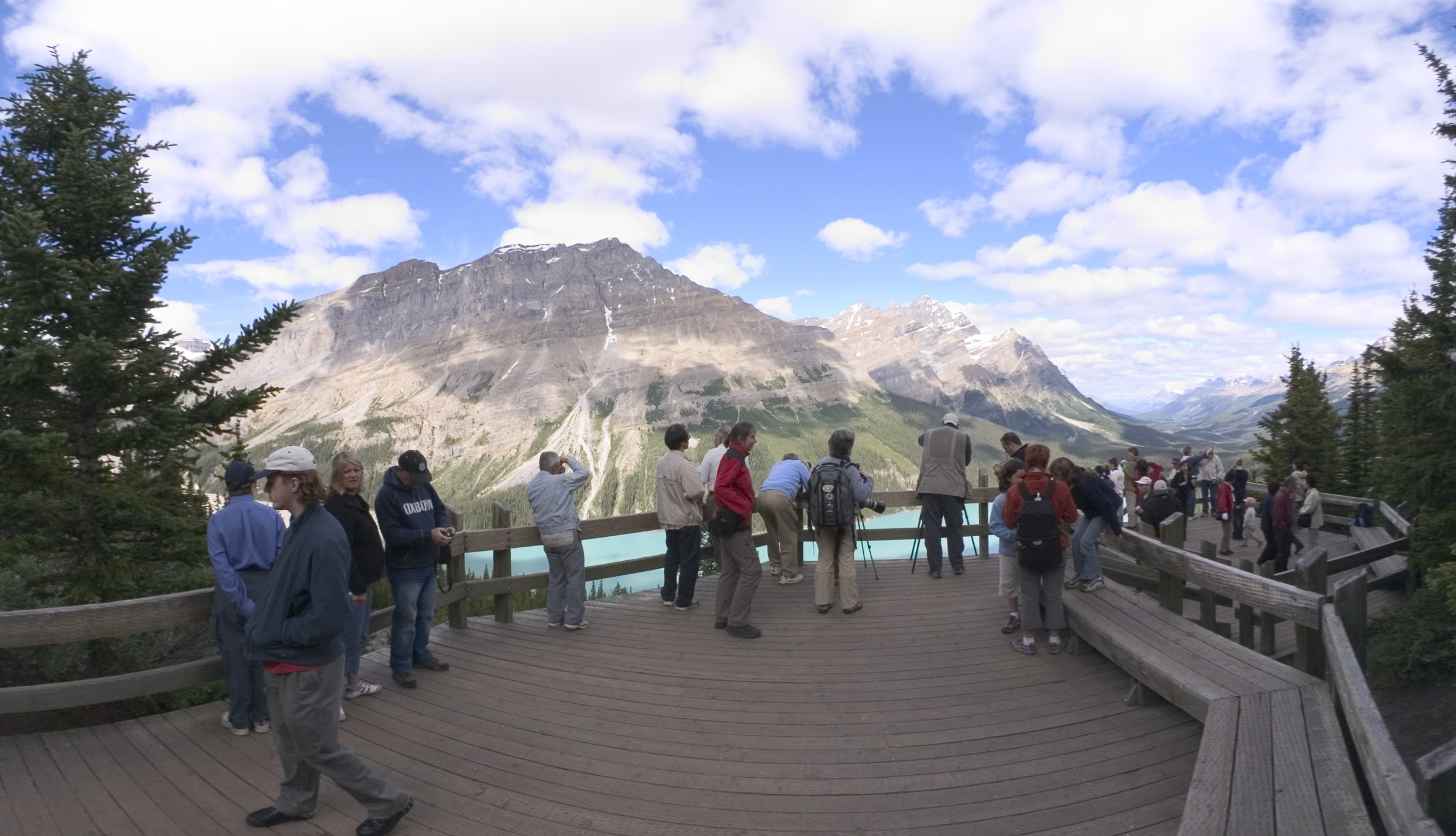 wooden platform overlooking stunningly turquoise Peyto Lake. The